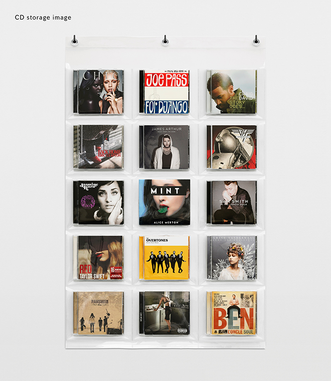 お気に入りのCDジャケットを壁面に15枚収納できるディスプレイポケット。